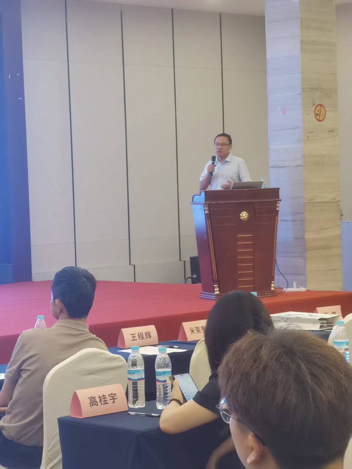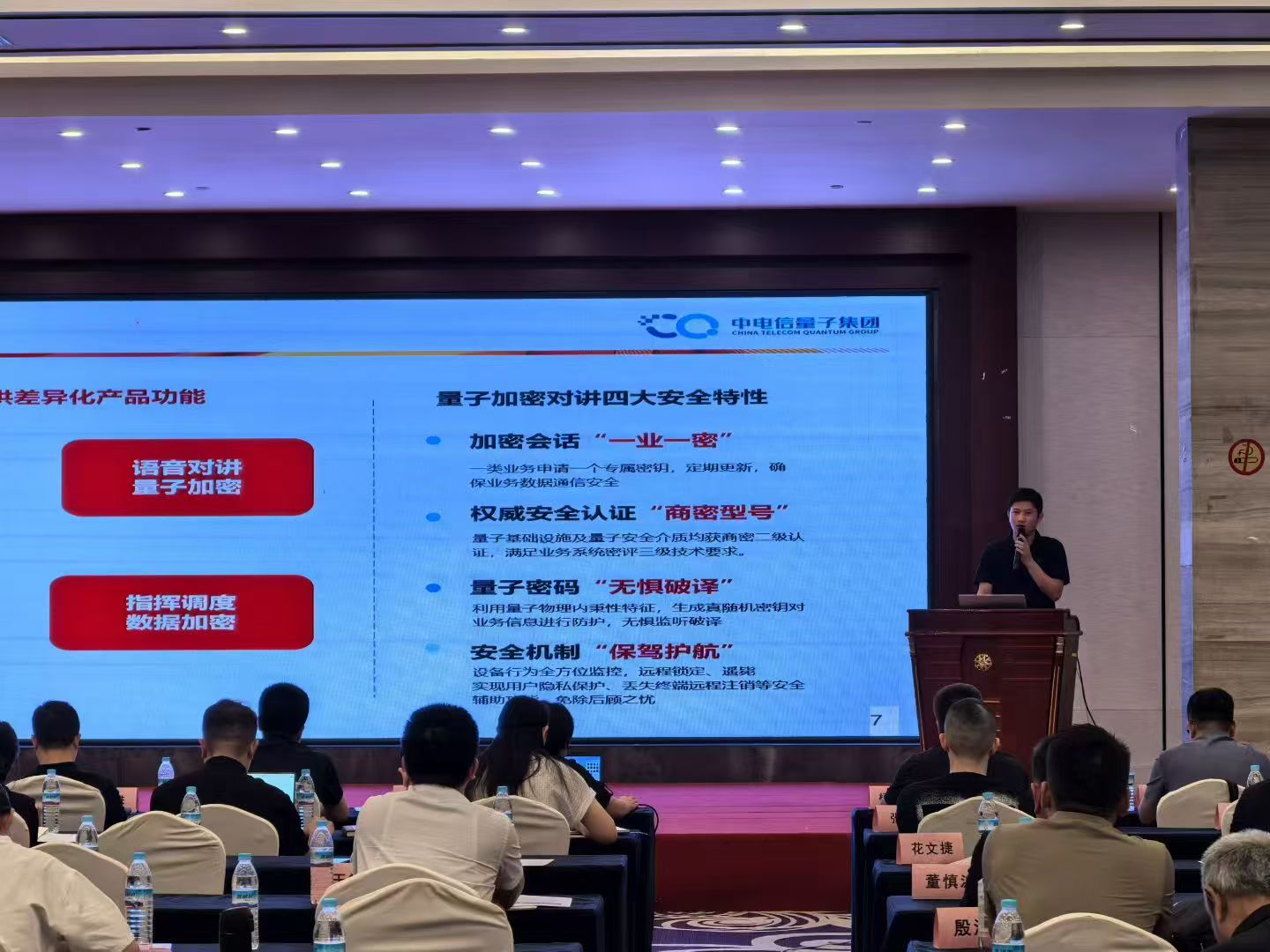 中电信量子集团语音产品线总经理王轶和产品经理琚佳鸿,海能达国内销售部总裁助理米荣奎,我司总经理胡三陆、副总经理程东升上台宣讲。